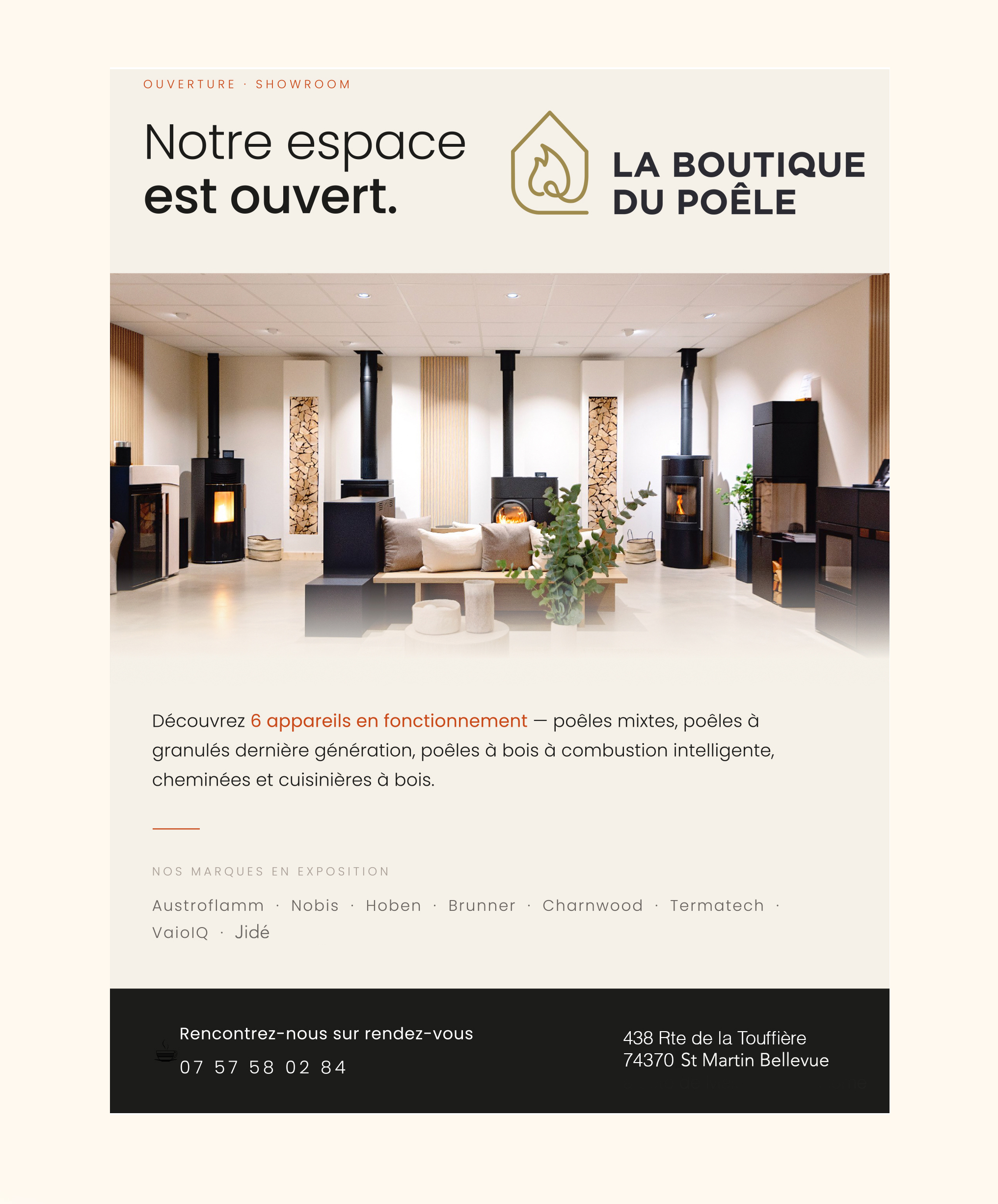 Actualités Promotion Printemps 2026LIRE lancement du E-Skye 700 le poêle à à Bois de Charnwood avec régulation électronique de combustion : une révolutionLIRE Nouveau : Pose des poêles à Bois Charnwood sur AnnecyLIRE HOBEN offre une palette de granulésLIRE Promotion Poeles HOBEN & KLOVERLIRE Nouveau : installateur des poêles à Granulés NOBIS sur AnnecyLIRE Nouveau : installateur des poêles Austroflamm sur AnnecyLIRE Journées Privées HOBEN – PromotionLIRE Redesign HOBEN H7 ClassicLIRE Nouveau KLOVER Super 7 au showroomLIRE Comprendre l’augmentation du prix du granuléLIRE Nouveau HOBEN H7 CréationLIRE Démarrer mon projet Planifier mon entretien